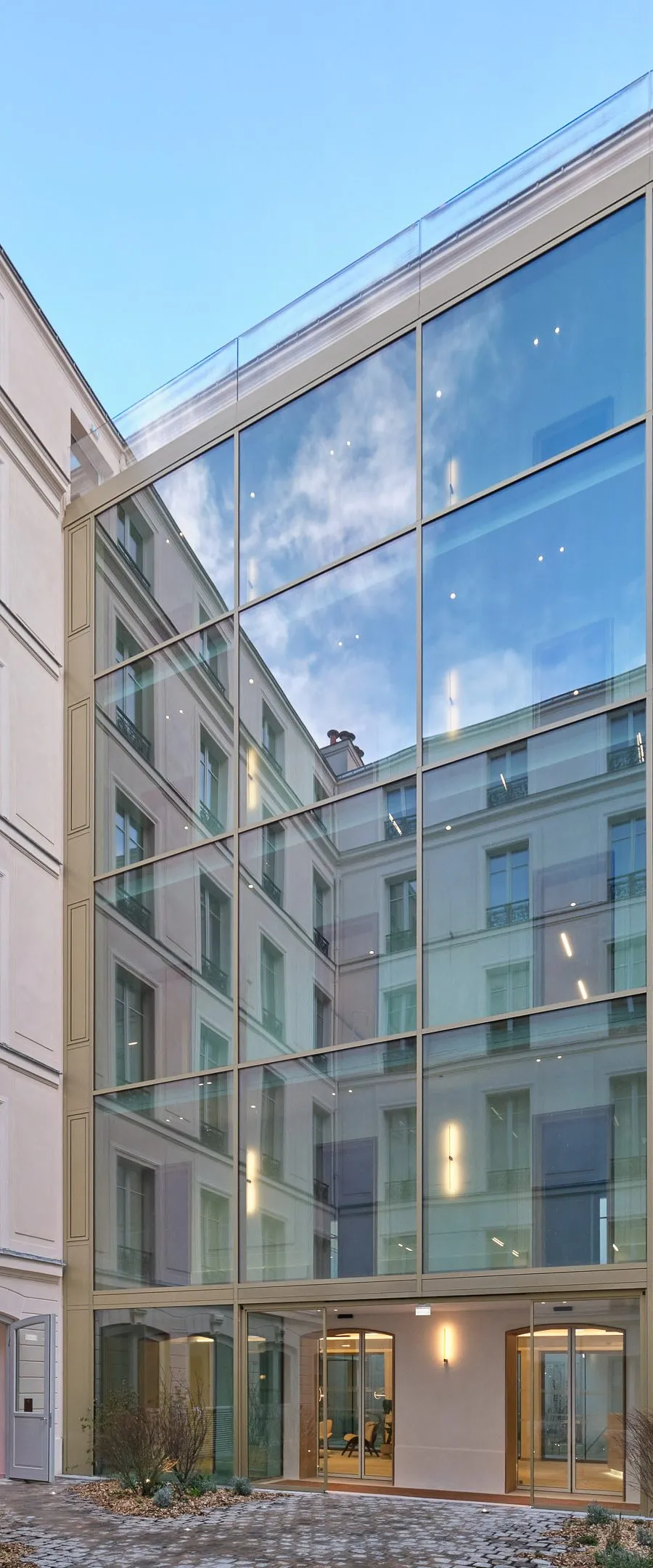 Le projet prévoit entre autre la création d’une double-peau vitrée dans la cour intérieure pour créer une continuité sur chaque plateau, une connexion entre les bâtiments avant et arrière. La création d’une verrière en toiture du R+1. La création d’espaces extérieurs végétalisés en toiture au R+5 pour agrémenter les espaces de travail.